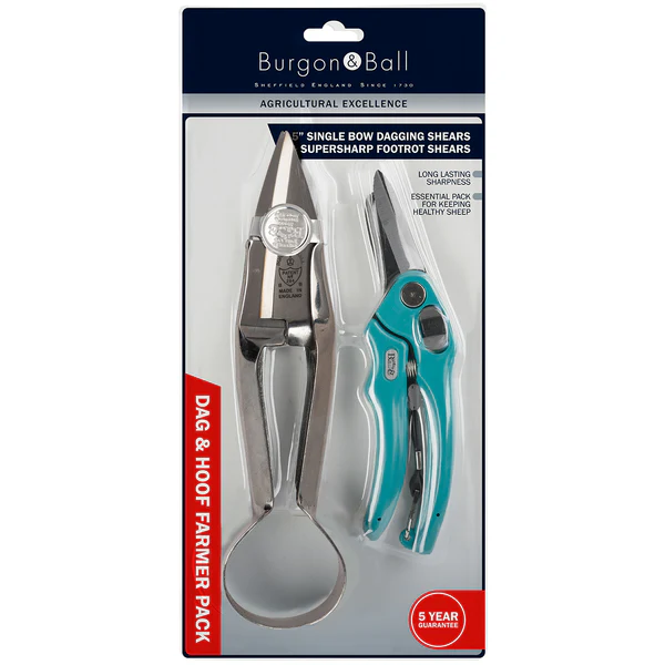 A handy pack of two essentials for keeping healthy sheep: a 3.5″ single bow dagging shear and a Supersharp footrot shear.